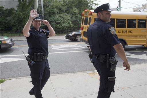 Police officer Mary Gillespie, left, of the 120th precinct on Staten Island borough of New York, waves at a residents of the Richmond Terrace Houses while on patrol with fellow officer Jessi D'Ambrosio on Thursday, July 7, 2016. In 2015, the city began assigning pairs of officers to specific neighborhoods, rather than having them rush from call to call across precincts. They are mandated to spend a third of their shift "off-radio," talking with residents to forge relationships. The new approach was rolled out to the North Shore in December. (AP Photo/Mary Altaffer)