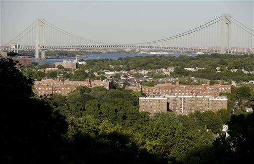 This Tuesday, June 14, 2016 photo shows the VerrazanoâNarrows Bridge and the north side of the Staten Island borough of New York, foreground. Very few blacks live south of the Staten Island Expressway which continues from the bridge, and which some residents say amounts to a local Mason-Dixon line, reinforcing divisions of race and economics that shade the tensions around policing. (AP Photo/Seth Wenig)
