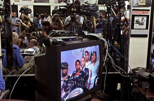 FILE - In this Tuesday, July 14, 2015 file photo, The Rev. Al Sharpton, center, is seen on a television monitor, joined by Eric Garner's mother, Gwen Carr, left; daughter, Erica Garner, second from left; son, Eric Garner, third from left; daughter, Emerald Snipes, second from right, and wife, Esaw Snipes, during a news conference in New York. The family of Garner, a black man who died after being placed in a white police officer's chokehold, discussed the $5.9 million settlement it reached with the city days before the anniversary of his death. (AP Photo/Mary Altaffer)