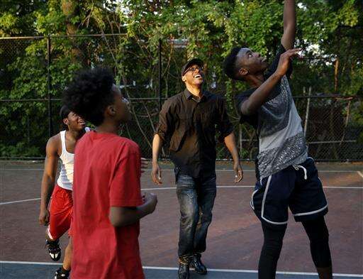 Leroy Downs plays basketball with local kids in the Staten Island borough of New York, Wednesday, May 25, 2016. Downs, 41, has lived on Staten Island since he was 5 and works as a drug treatment counselor. But he has thought about, just maybe, becoming a cop. Itâs not hard to imagine, given his almost paternal attention to the neighborhood. Except that Downs, has gone to court to fight the NYPD, and its widespread stop-and-frisks, mostly of black and Hispanic men. (AP Photo/Seth Wenig)