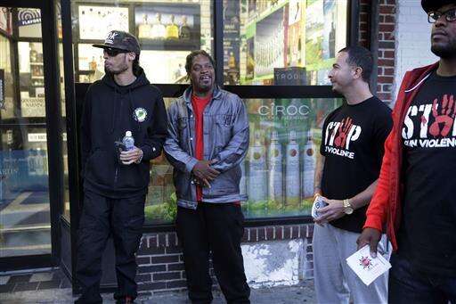 Members of the Cure Violence group talk with a man near the Stapleton Houses low-income housing complex in the Staten Island borough of New York, Wednesday, June 8, 2016. The group, five black men and one Latino, all acknowledge past crimes or prison time. Mike Perry, second right, used to deal drugs around another low-income housing complex, two miles away. Now, though, their team works to defuse arguments that can lead to shootings and match people with job training and counseling. (AP Photo/Seth Wenig)