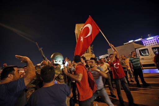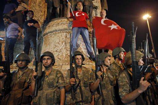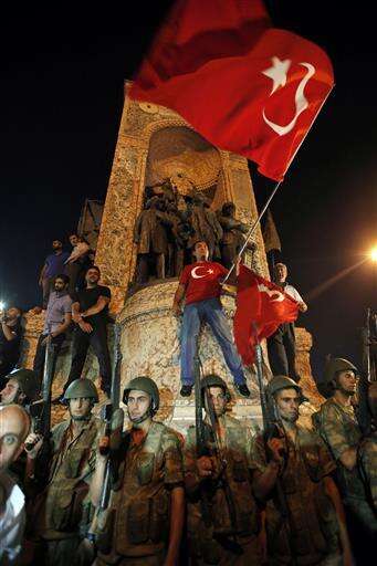 The military has taken position at the base of the Taksim monument at Taksim square in Istanbul, occasionally firing into the air to disperse a growing crowd of government supporters.