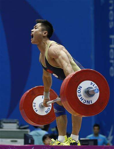 FILE - In this Sept. 23, 2014, file photo, China's Lyu Xiaojun attempts a lift during the men's 77kg weightlifting competition at the 17th Asian Games in Incheon, South Korea. Lu Xiaojun is a best bet to win at 77 kg. at the Rio Olympics. (AP Photo/Kin Cheung, File) The Associated Press