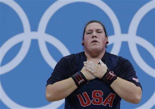 FILE - In this Aug. 5, 2012, file photo, United States' Sarah Robles reacts following a lift during the women's +75-kg. weightlifting competition at the 2012 Summer Olympics in London. Robles, Morghan King, Jenny Arthur and Kendrick Farris will represent the U.S. at the Rio Olympics. (AP Photo/Hassan Ammar, File) The Associated Press
