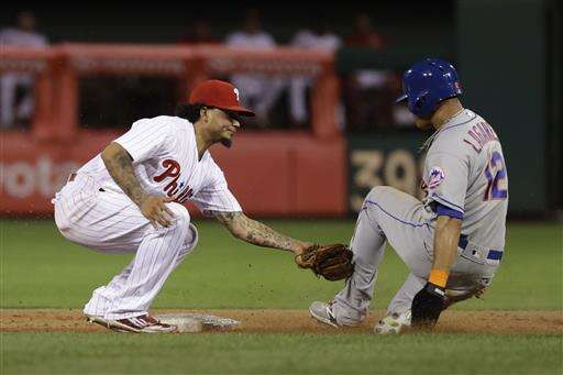 New York Mets' Juan Lagares, right, is tagged out by Philadelphia Phillies shortstop Freddy Galvis on an attempted steal of second base during the ninth inning of a baseball game, Friday, July 15, 2016, in Philadelphia. New York won 5-3. (AP Photo/Matt Slocum) The Associated Press