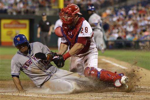 New York Mets' Juan Lagares, left, slides into Philadelphia Phillies catcher Cameron Rupp to score on a ball hit by Jose Reyes during the seventh inning of a baseball game, Friday, July 15, 2016, in Philadelphia. New York won 5-3. (AP Photo/Matt Slocum) The Associated Press
