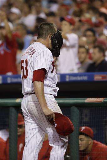 Philadelphia Phillies starting pitcher Jeremy Hellickson covers his face as he walks to the dugout after the sixth inning of a baseball game against the New York Mets, Friday, July 15, 2016, in Philadelphia. New York won 5-3. (AP Photo/Matt Slocum) The Associated Press
