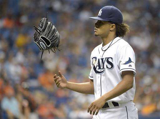 Tampa Bay Rays starting pitcher Chris Archer flips his glove in the air while walking off the mound after giving up one run in the sixth inning of a baseball game against the Baltimore Orioles in St. Petersburg, Fla., Friday, July 15, 2016. (AP Photo/Phelan M. Ebenhack) The Associated Press