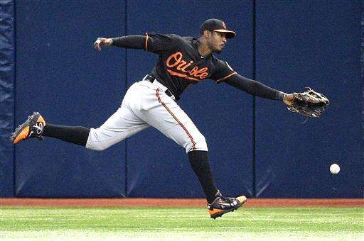 Baltimore Orioles center fielder Adam Jones can't reach a fly ball that drops in for a triple by Tampa Bay Rays' Brandon Guyer during the fifth inning of a baseball game in St. Petersburg, Fla., Friday, July 15, 2016. (AP Photo/Phelan M. Ebenhack) The Associated Press