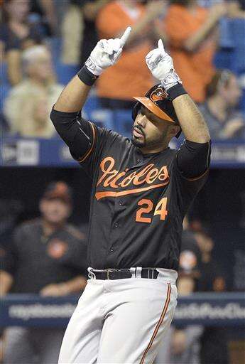 Baltimore Orioles' Pedro Alvarez (24) celebrates as he steps on home plate after hitting a solo home run off Tampa Bay Rays starting pitcher Chris Archer during the second inning of a baseball game in St. Petersburg, Fla., Friday, July 15, 2016. (AP Photo/Phelan M. Ebenhack) The Associated Press