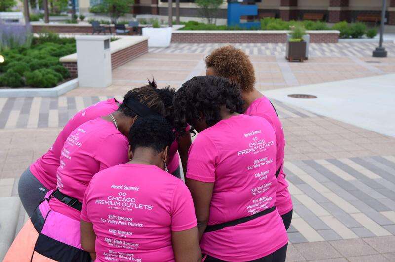 Members of the New Community Baptist Church in Aurora pray before the start of the 2nd 2 None 5K race Sunday at Chicago Premium Outlets in Aurora.