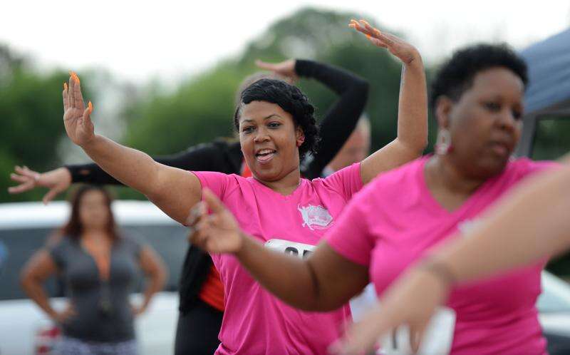 Penny Finley of Aurora participates in a warm-up dance led by Dance Fuze Studio on Sunday before the start of the annual 2nd 2 None 5K race at Chicago Premium Outlets in Aurora. Finley raced with fellow members of the New Community Baptist Church in Aurora.