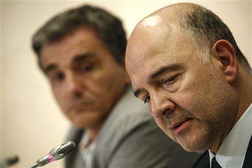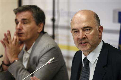 European Union Commissioner for Economic Affairs Pierre Moscovici, right, addresses journalists during a news conference with Greek Finance Minister Euclid Tsakalotos in Athens, Monday, July 18, 2016. Moscovici is on a one-day visit to Athens to hold meetings with the Greek Prime Minister, and ministers of Economy and Labour. (AP Photo) The Associated Press