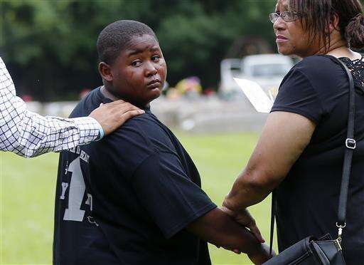 FILE - In this July 15, 2016, file photo, Na'Quincy, son of Alton Sterling, looks back at his father's grave as he leaves Alton's burial, at the Mount Pilgrim Benevolent Society Cemetery in Baton Rouge, La. Sterling was shot July 5 outside a Baton Rouge convenience store in an encounter with police that was caught on video. Left is family attorney Justin Bamberg, and right is Na'Qunicy's grandmother, whose name was withheld. (AP Photo/Gerald Herbert, Pool, File) The Associated Press