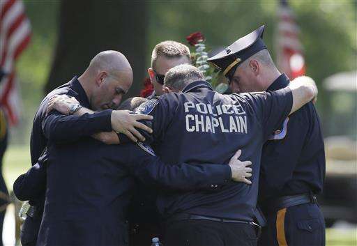 FILE - In this July 14, 2016, file photo, Law enforcement officers pray after the graveside service for Dallas police Sgt. Michael J. Smith at Restland Funeral Home and Cemetery in Dallas. Smith was one of five police officers killed during protest in Dallas. (AP Photo/LM Otero, File) The Associated Press