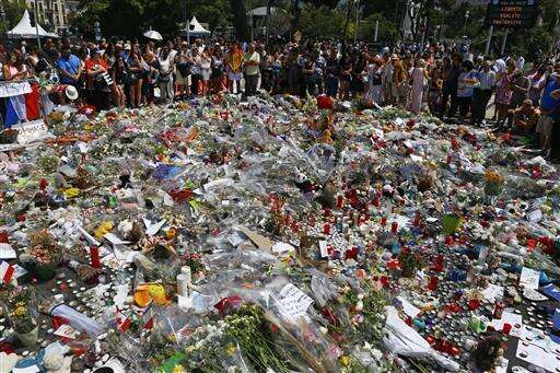 FILE - In this Monday, July 18, 2016, file photo, people gather at the makeshift memorial after a minute of silence on the famed Promenade des Anglais in Nice, southern France, to honor the victims of an attack near the area where a truck mowed through revelers. (AP Photo/Francois Mori, File) The Associated Press