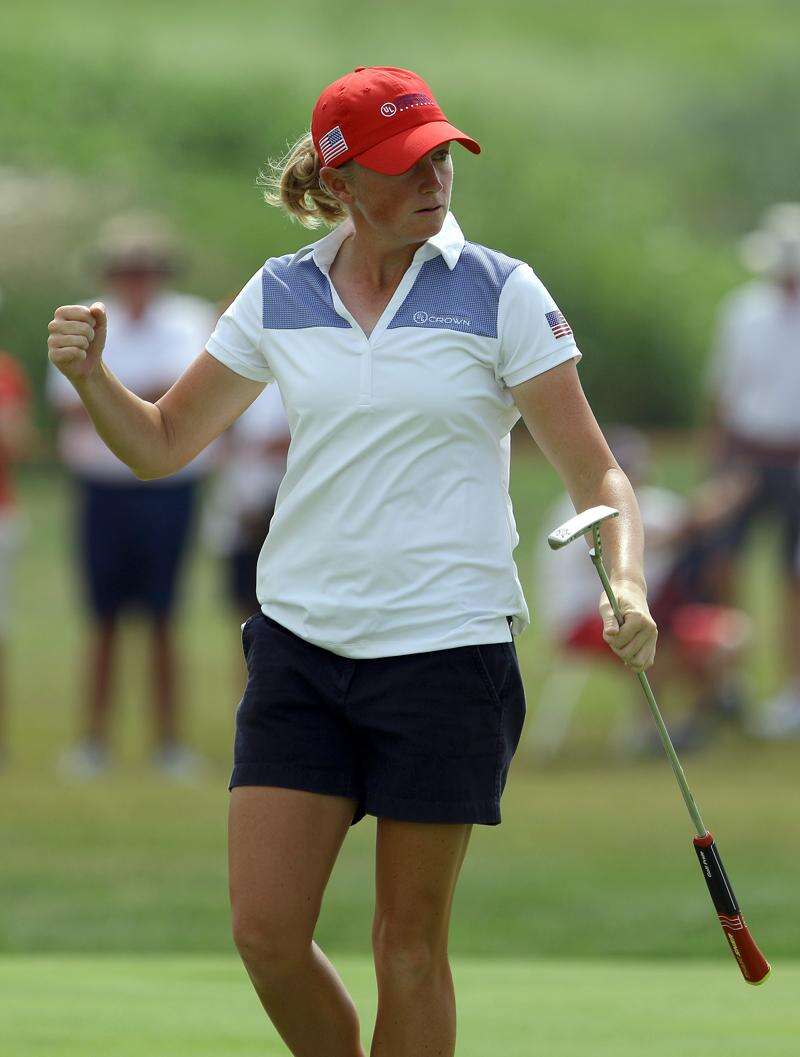 Stacy Lewis pumps her fist after making a birdie on the 4th hole during first round of the UL International Crown women's golf tournament at the Merit Club in Gurnee Thursday.