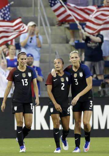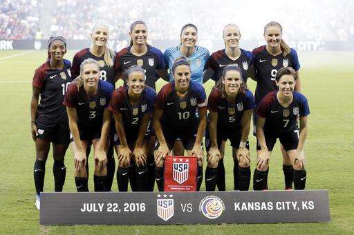 The United States national team poses for a photo before a women's international friendly soccer match against Costa Rica, Friday, July. 22, 2016, in Kansas City, Kan. (AP Photo/Colin E. Braley)