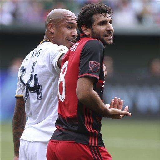 Portland Timbers' Diego Valeri (8) appeals to the referee after being called for a foul against Los Angeles Galaxy's Nigel de Jong, rear, during an MLS soccer game Saturday, July 23, 2016, in Portland, Ore. The Galaxy won 2-1. (Pete Christopher/The Oregonian via AP) The Associated Press