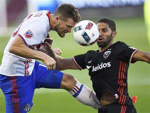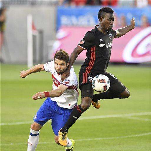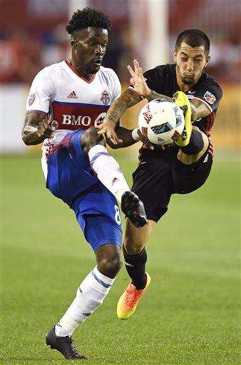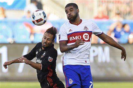 Toronto FC's Drew Moor, left, and D.C. United's Lloyd Sam vie for the ball during the first half of an MLS soccer match in Toronto on Saturday, July 23, 2016. (Frank Gunn/The Canadian Press via AP) The Associated Press