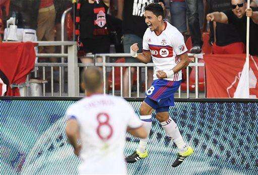 Toronto FC's Marky Delgado leaps to celebrate his goal against D.C. United as teammate Benoit Cheyrou watches during the first half of an MLS soccer match in Toronto on Saturday, July 23, 2016. (Frank Gunn/The Canadian Press via AP) The Associated Press