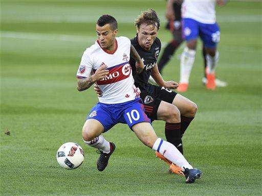 Toronto FC's Sebastian Giovinco, left, moves the ball past D.C. United's Jared Jeffrey during the first half of an MLS soccer match in Toronto on Saturday, July 23, 2016. (Frank Gunn/The Canadian Press via AP) The Associated Press