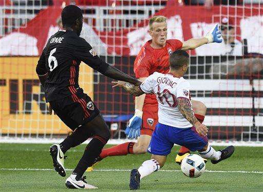 Toronto FC's Sebastian Giovinco shoots the ball on goal as D.C. United goalkeeper Travis Worra and United's Kofi Opare defend during the first half of an MLS soccer match in Toronto on Saturday, July 23, 2016. (Frank Gunn/The Canadian Press via AP) The Associated Press