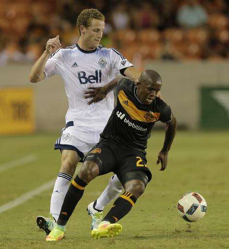 Vancouver Whitecaps midfielder Matias Laba (15) holds off Houston Dynamo defender Will Bruin as he brings the ball up during the first half of an MLS soccer match Saturday, July 23, 2016, in Houston. (AP Photo/Bob Levey)