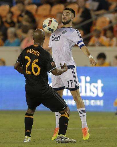 Vancouver Whitecaps midfielder Pedro Morales (77) chests the ball in front of Houston Dynamo midfielder Collen Warner (26) during the first half during an MLS soccer match Saturday, July 23, 2016, in Houston. (AP Photo/Bob Levey)