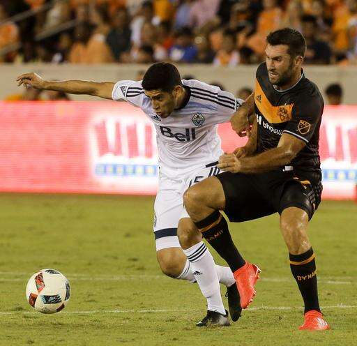 Houston Dynamo midfielder Oscar Garcia (27) fends off Vancouver Whitecaps defender Cole Seiler (14) during the first half during an MLS soccer match Saturday, July 23, 2016, in Houston. (AP Photo/Bob Levey)