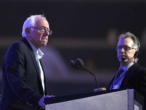 Former Democratic presidential candidate Sen. Bernie Sanders, I-Vt., stands at the podium as he tours the Wells Fargo Center during the first day of the Democratic National Convention in Philadelphia , Monday, July 25, 2016. (AP Photo/Mark J. Terrill) The Associated Press