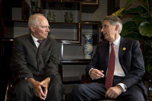 Britain's Chancellor of the Exchequer Philip Hammond, right, chats with Germany's Federal Minister of Finance Wolfgang Schauble before a private lunch on the sidelines of the G20 High-level Tax Symposium held in Chengdu in Southwestern China's Sichuan province, Saturday, July 23, 2016. Finance ministers and Central Bank governors of the 20 most developed economies are to meet in the southwestern city of Chengdu ahead of a G20 leaders meeting in September hosted by China. (AP Photo/Ng Han Guan, Pool) The Associated Press