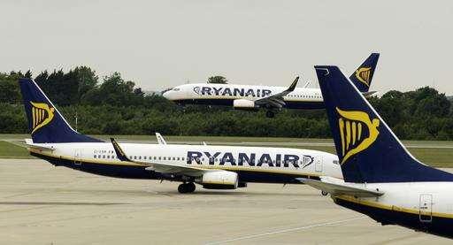 FILE- In this Tuesday July 21, 2009 file photo, Ryanair planes are seen at Stansted Airport in England. Ryanair said Monday, July 25, 2016 it will reduce winter services at its main London hub and focus on other European bases because of weakened British growth and consumer sentiment following Britain’s vote to leave the EU. (AP Photo/Matt Dunham, File). The Associated Press
