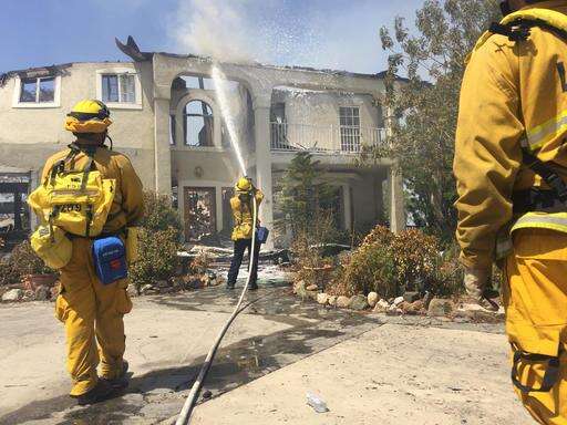 Firefighters use foam to put out flare ups on a home at the end of Iron Canyon in Santa Clarita, Calif., on Sunday, July 24, 2016. Authorities say 18 homes have been destroyed and an additional 1,500 are threatened as crews battle a massive wildfire in wooded canyons north of Los Angeles. The blaze has blackened more than 34 square miles of dry brush withered by days of triple-digit heat on the edge of the Angeles National Forest. It was just 10 percent contained Sunday. (Katharine Lotze/The Santa Clarita Valley Signal via AP) The Associated Press
