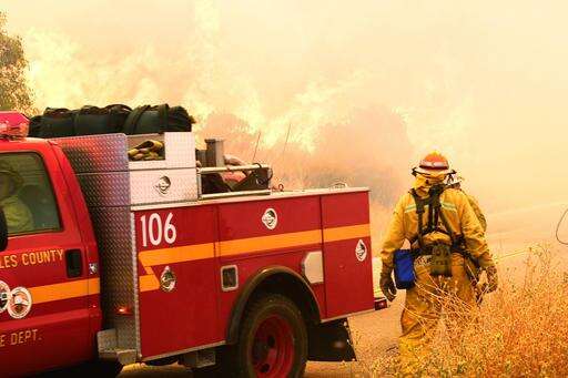 A Los Angeles County firefighter tries to fight the flames against erratic winds in Placenta Caynon Road in Santa Clarita, Calif., Sunday, July 24, 2016. Flames raced down a steep hillside "like a freight train," leaving smoldering remains of homes and warnings that more communities should be ready to flee the wildfire churning through tinder-dry canyons in Southern California, authorities said Sunday. (AP Photo/Matt Hartman) The Associated Press