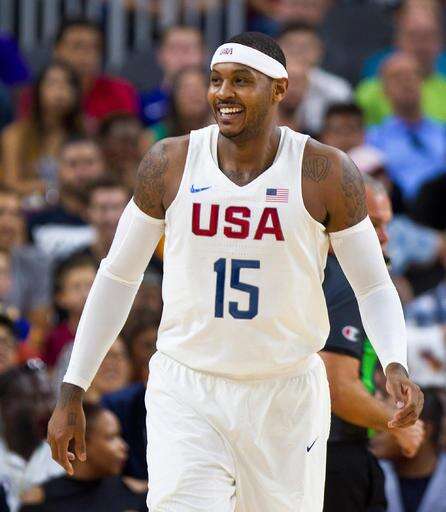 In this Friday, July 22, 2016 photo, United States forward Carmelo Anthony (15) smiles during the first half of their warm-up international exhibition game versus Argentina in Las Vegas. With only a few spare hours Monday before jetting off to continue the Americans' pre-Olympic tour, Anthony gathered basketball stars, community leaders and police officers to speak with teenagers and young adults about the importance of respect, communication and safety. (AP Photo/L.E. Baskow) The Associated Press