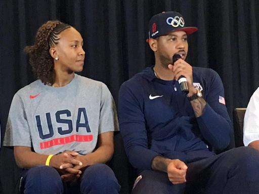 New York Knicks forward Carmelo Anthony speaks with Tanika Catchings of the WNBA Indiana Fever as they spent the U.S. Olympic basketball team's precious day off running a two-hour town hall meeting at a South Los Angeles youth center Monday, July 25, 2016. Anthony gathered basketball stars, community leaders and police officers to speak with teenagers and young adults about the importance of respect, communication and safety. (AP Photo/Greg Beacham) The Associated Press