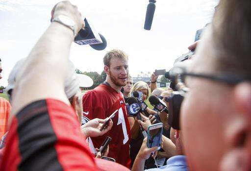 Philadelphia Eagles quarterback Carson Wentz takes questions from the media following practice at NFL football training camp, Monday, July 25, 2016, in Philadelphia. (AP Photo/Chris Szagola) The Associated Press