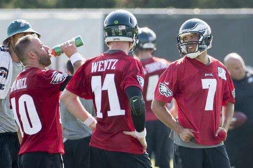 Philadelphia Eagles quarterback Sam Bradford, right, looks back as quarterback Chase Daniel, left, gets a drink with quarterback Carson Wentz, center, looking on during practice at NFL football training camp, Monday, July 25, 2016, in Philadelphia. (AP Photo/Chris Szagola) The Associated Press