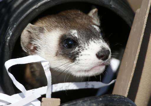 FILE - In this Oct. 5, 2015, file photo, a black-footed ferret looks out from a carrier during a release of 30 ferrets by the U.S. Fish and Wildlife Service at the Rocky Mountain Arsenal National Wildlife Refuge in Commerce City, Colo. The endangered weasel is returning to an area of western Wyoming where the critter almost went extinct more than 30 years ago. Biologists plan to release 35 black-footed ferrets Tuesday, July 26, 2016, near Meeteetse, Wyo. Scientists thought the black-footed ferret was extinct until a dog brought a dead one home near Meeteetse in 1981. (AP Photo/David Zalubowski, File) The Associated Press