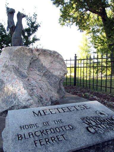 FILE - This Sept. 20, 2011, file photo shows a monument to black-footed ferrets in Meeteese, Wyo. The endangered weasel is returning to the area of western Wyoming where the critter almost went extinct more than 30 years ago. Biologists plan to release 35 black-footed ferrets Tuesday, July 26, 2016, near Meeteetse, Wyo. Scientists thought the black-footed ferret was extinct until a dog brought a dead one home near Meeteetse in 1981. (AP Photo/Mead Gruver, File) The Associated Press
