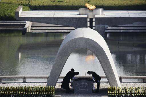 FILE - In this Aug. 6, 2015 file photo, Kazumi Matsui, right, mayor of Hiroshima, and the family of the deceased bow before they place the victims list of the Atomic Bomb at Hiroshima Memorial Cenotaph during the ceremony to mark the 70th anniversary of the bombing at the Hiroshima Peace Memorial Park in Hiroshima, western Japan. Hiroshima city has asked the developer of âPokemon Goâ to remove the atomic bomb memorial park as a âgymâ location in the popular smartphone game. The city made the request Tuesday, July 26, 2016. It is asking game developer Niantic Inc. to delete the park from the game by Aug. 6, when an annual ceremony is held to remember those who died in the 1945 bombing. (AP Photo/Eugene Hoshiko, File)