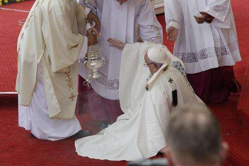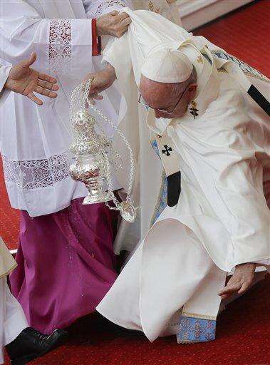 CZESTOCHOWA, Poland (AP) - Pope Francis missed a step and fell to the ground Thursday as he walked on an open-air platform to celebrate Mass at Poland's holiest shrine of Jasna Gora.