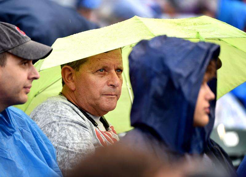 Kathryn Kern of Chicago catches an errant wet bat by Seattle Mariners center fielder Leonys Martin (12) in the seventh inning before the rain delay.