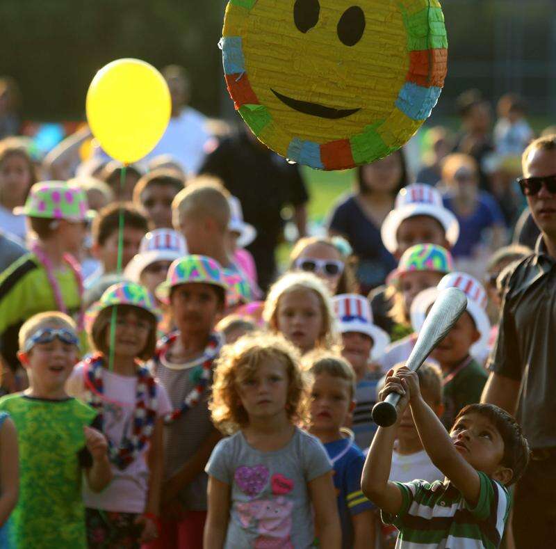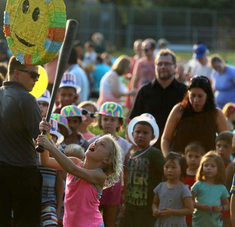 Jennifer Ryan, 7, of Elk Grove Village tries to break open a pinata Tuesday during National Night Out activities at Meineke Recreation Center in Schaumburg.