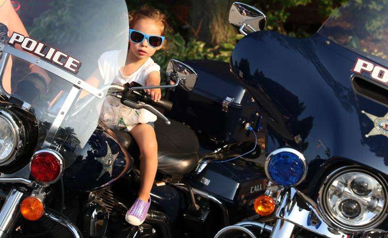 Eliana Gilbert, 3, of Arlington Heights checks out a police motorcycle Tuesday during National Night Out activities at North School Park in Arlington Heights.