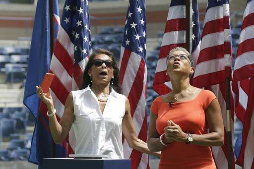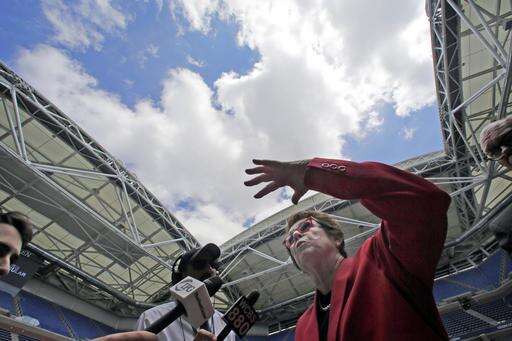 Tennis great Billie Jean King discusses the new retractable roof over Arthur Ashe Stadium, at the Billie Jean King National Tennis Center, in the Queens borough of New York, Tuesday, Aug. 2, 2016. Mother Nature will no longer be a problem at the U.S. Open as the U.S. Tennis Association unveiled the new retractable roof over Arthur Ashe Stadium. (AP Photo/Richard Drew)
