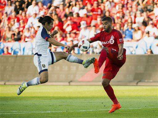 Real Salt Lake defender Tony Beltran, left, battles for the ball against Toronto FC forward Jordan Hamilton (22) during first half MLS soccer action in Toronto on Wednesday, Aug. 3, 2016. (Nathan Denette/The Canadian Press via AP)