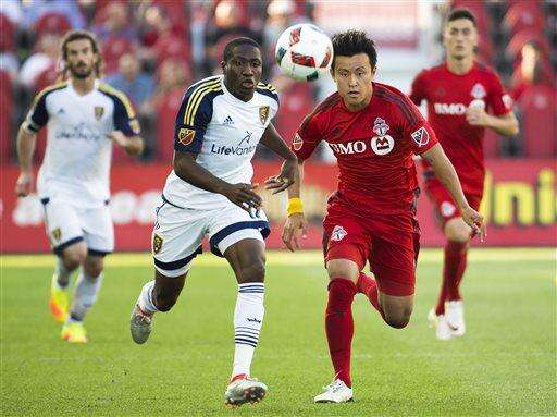 Toronto FC forward Tsubasa Endoh (9) battles for the loose ball against Real Salt Lake midfielder Demar Phillips (17) during first half MLS soccer action in Toronto on Wednesday, Aug. 3, 2016. (Nathan Denette/The Canadian Press via AP)