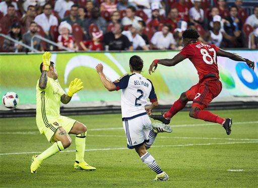Toronto FC forward Tosaint Ricketts (87) scores past Real Salt Lake goalkeeper Nick Rimando (18) as Real Salt Lake defender Tony Beltran (2) looks on during second half MLS soccer action in Toronto on Wednesday, Aug. 3, 2016. (Nathan Denette/The Canadian Press via AP)